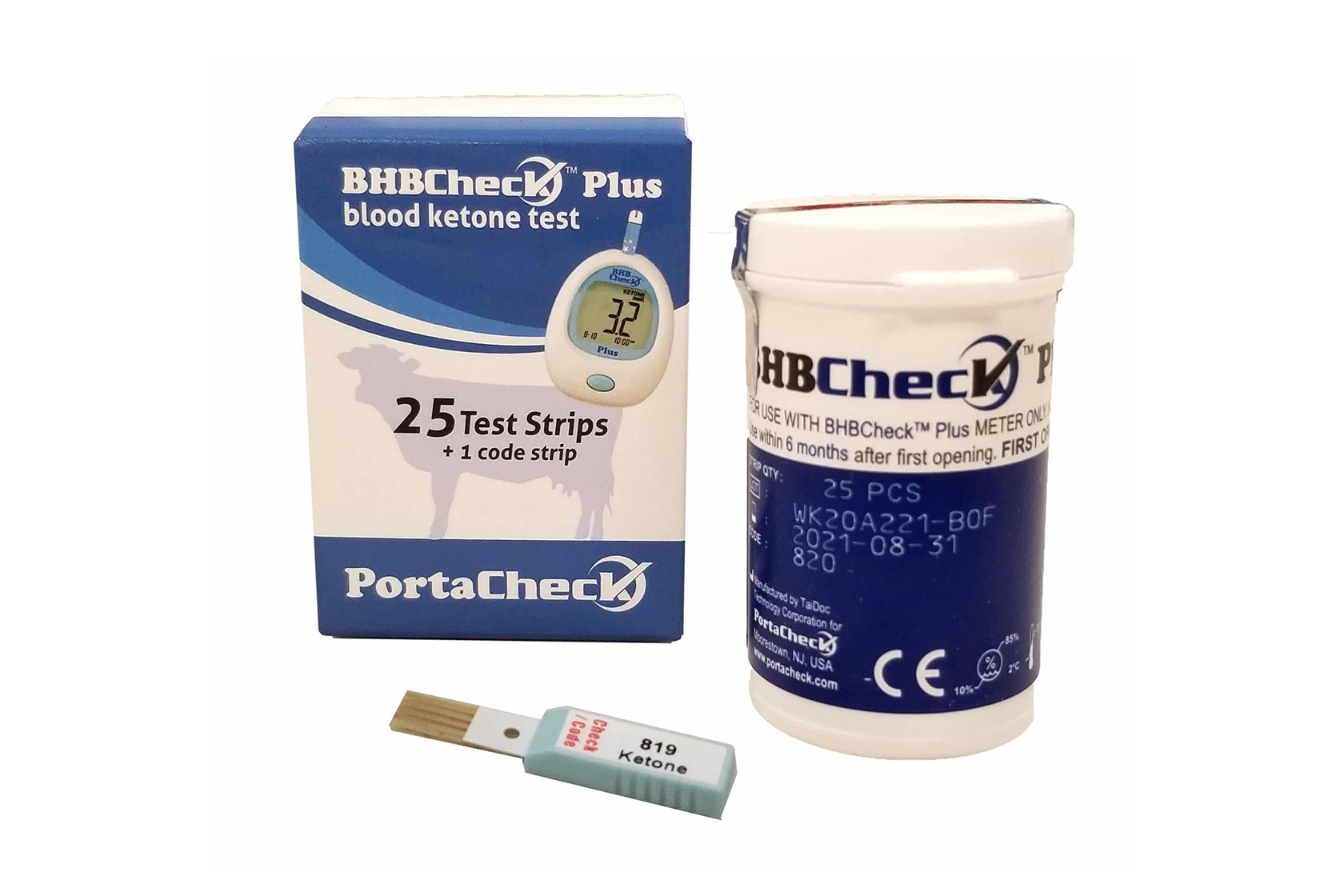 25 BHB blood ketone test strips and a calibration strip to let the meter know which test strip lot is being used.